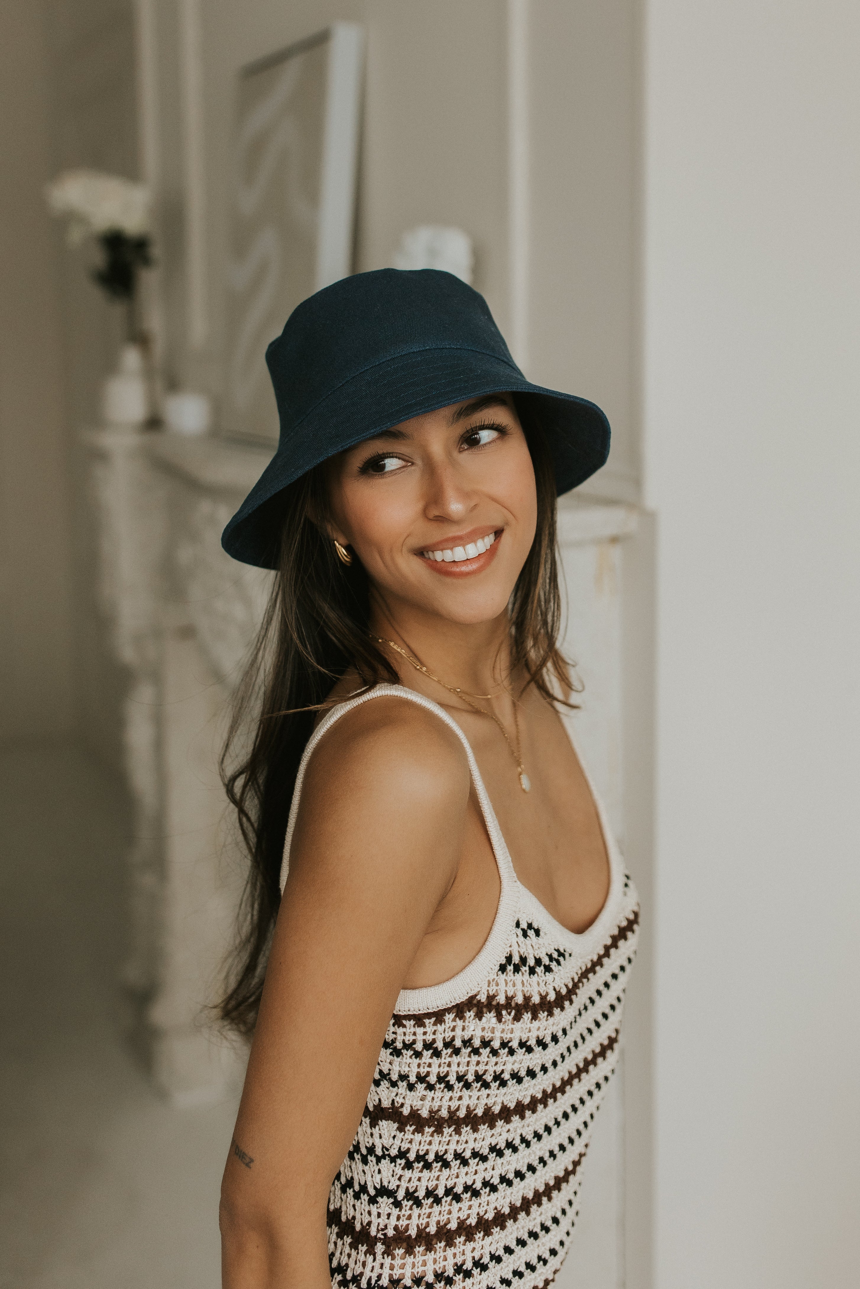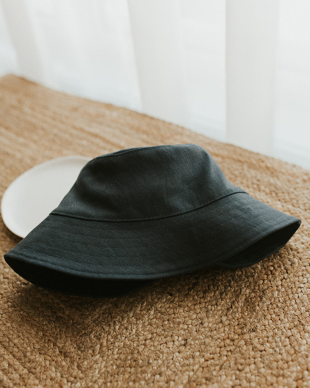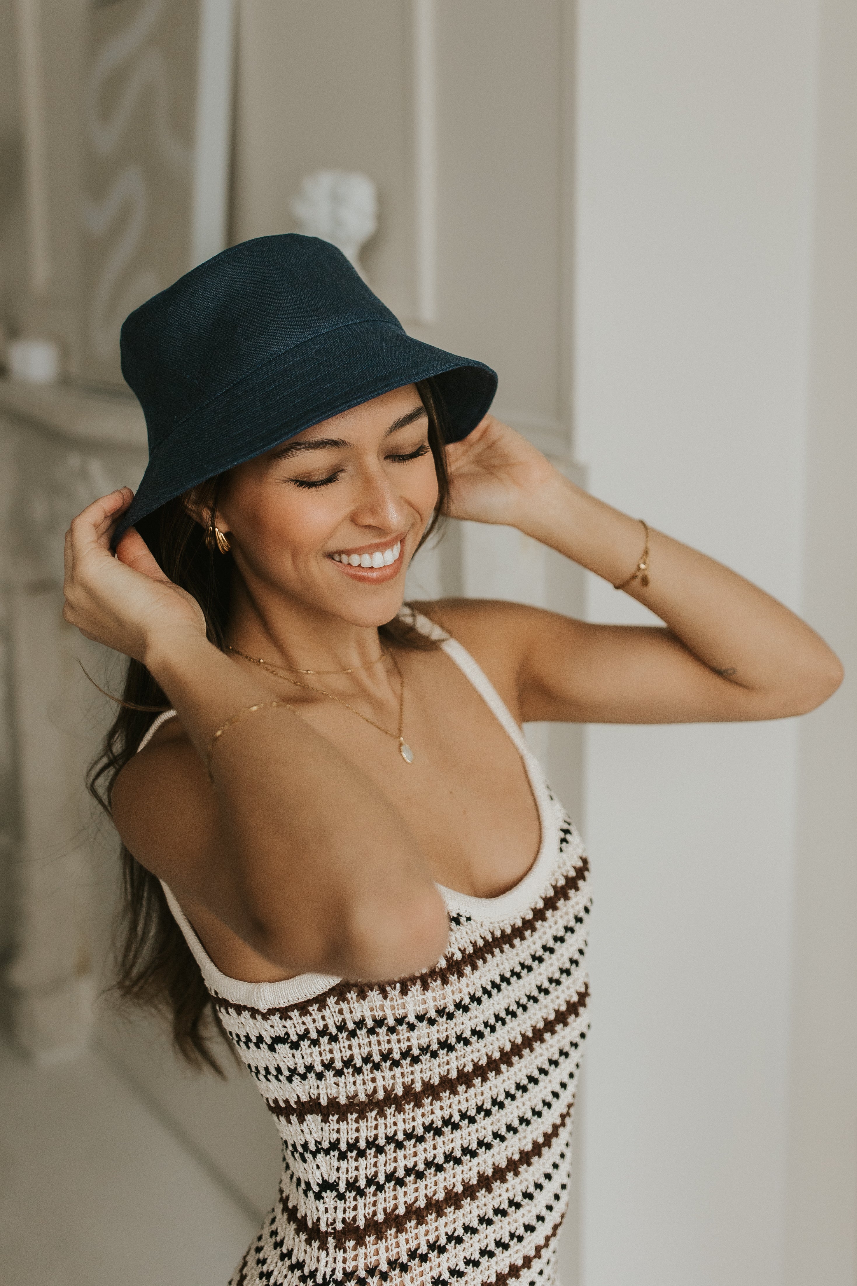 Notre Bucket Hat, 100 % lin marine, est fait à Granby, à la main, par nos couturières minutieuses.