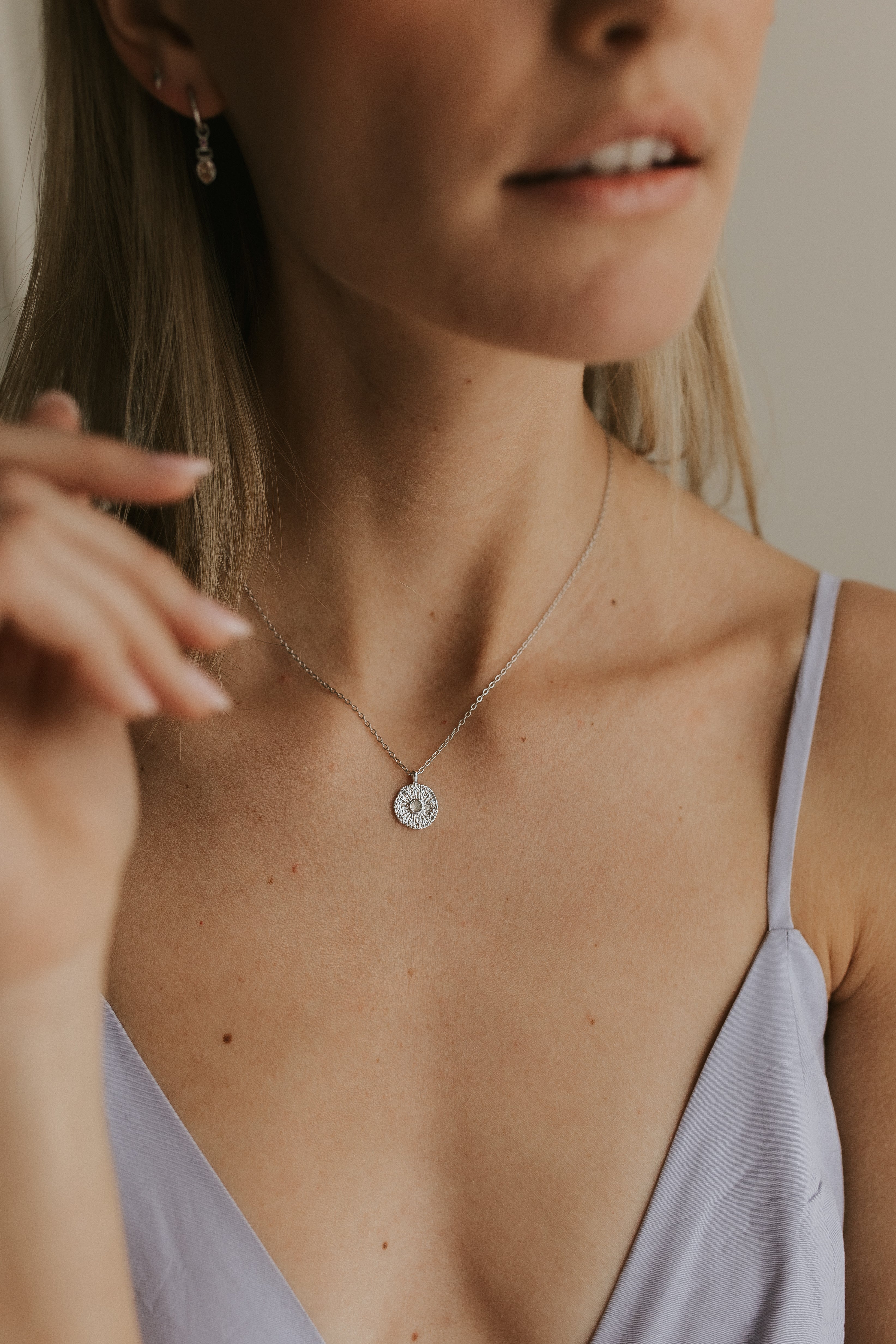 Notre chaîne Dalia, avec son médaillon rond et sa pierre de labradorite apporte une touche simpliste à votre look.