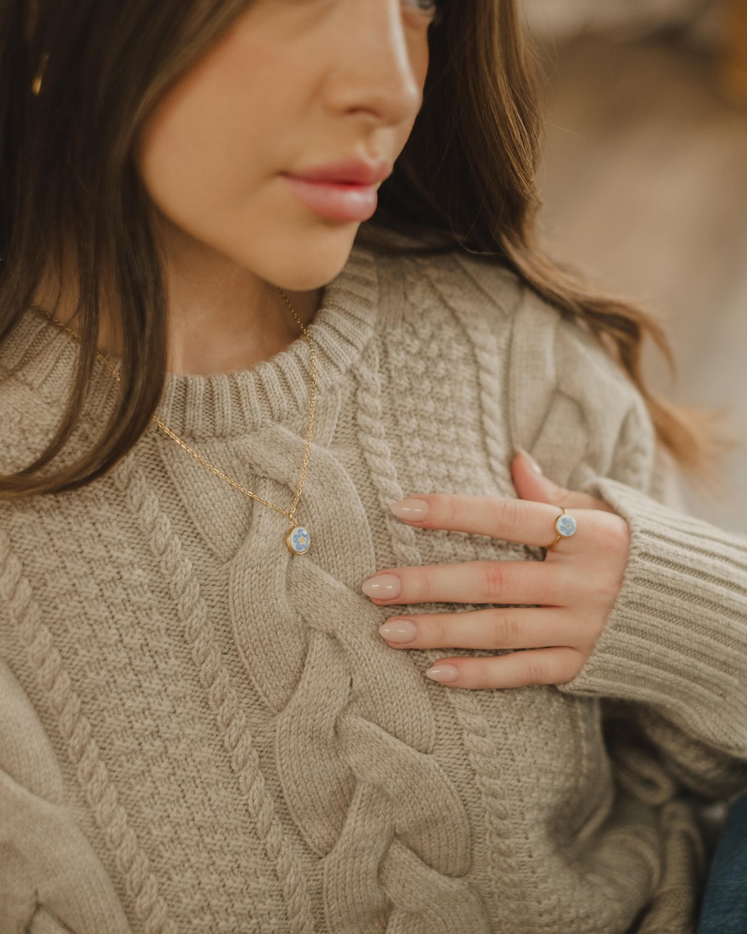 Notre bague Blooming est une pièce unique puisque chaque fleur est cueillie à la main par une artisane de Sutton, Boucle d'Argile. La petite fleur est un myosotis séché avec de l'argile polymère.