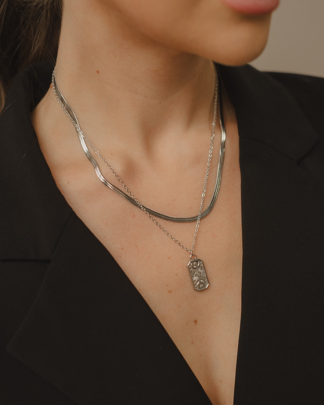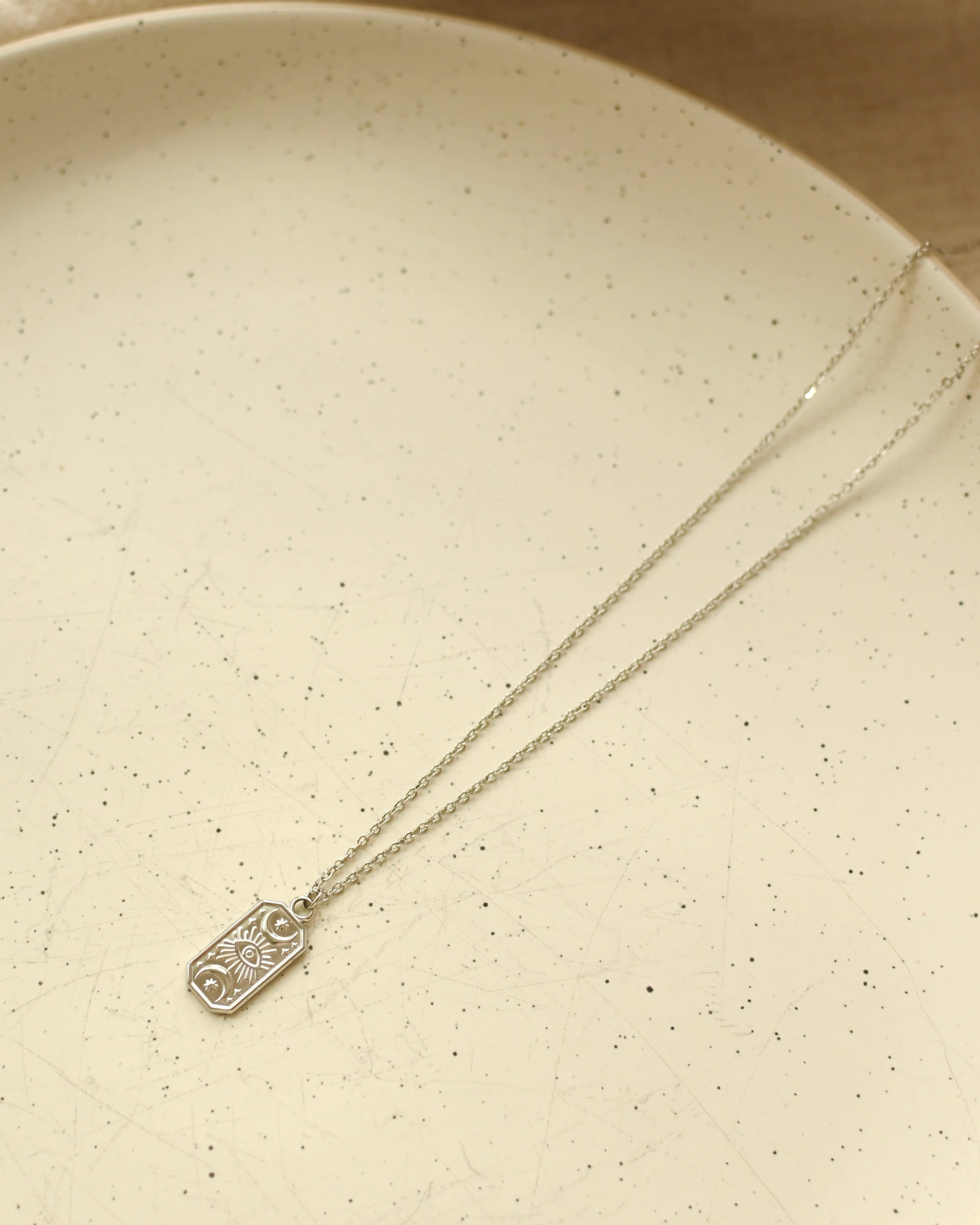 Our Spirit Chain, featuring a rectangular pendant with a raised lunar design, pairs perfectly with your daily style.