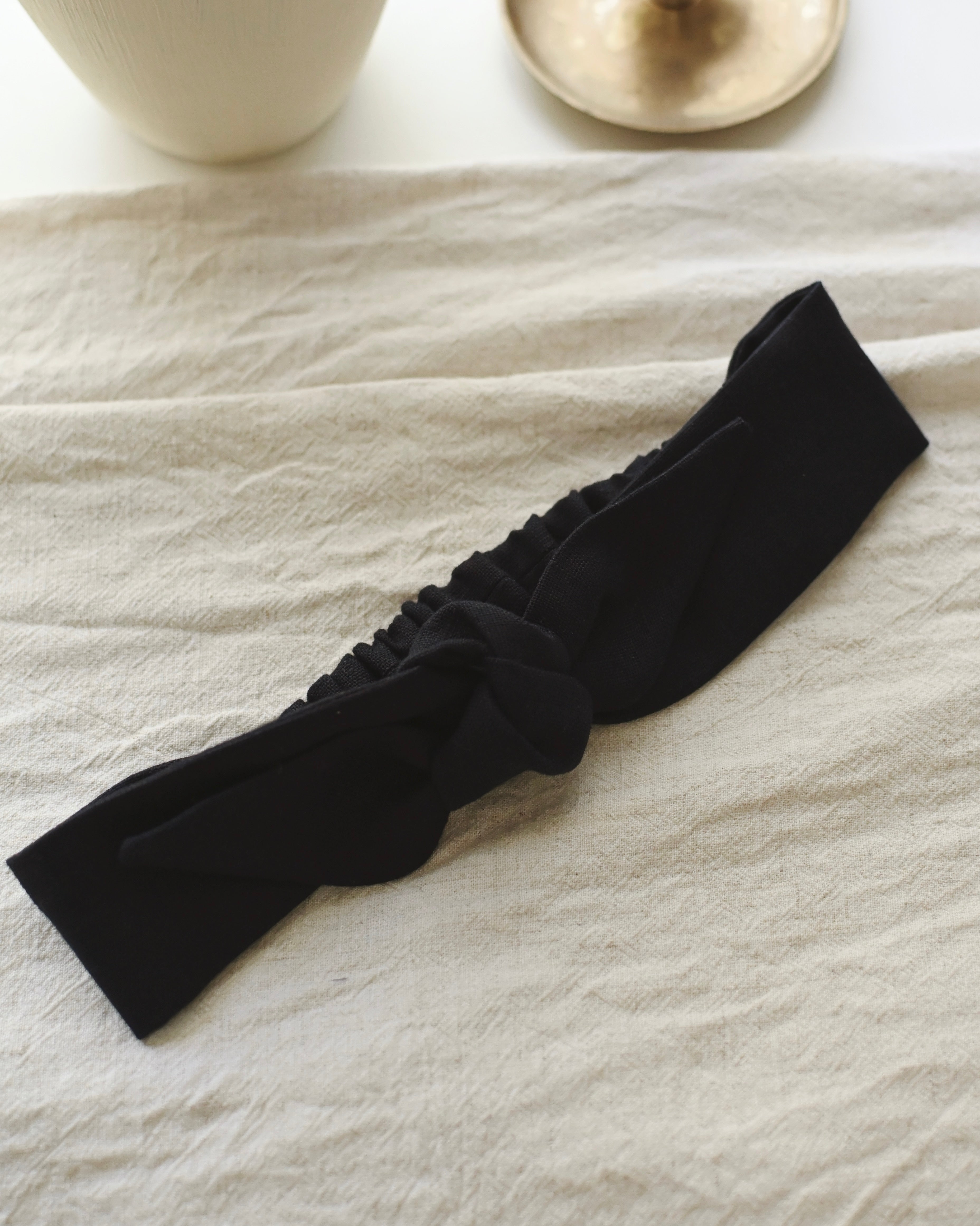 This headband is made of 100% linen. The fabric is breathable, stays securely in place, and won’t shift once worn.
